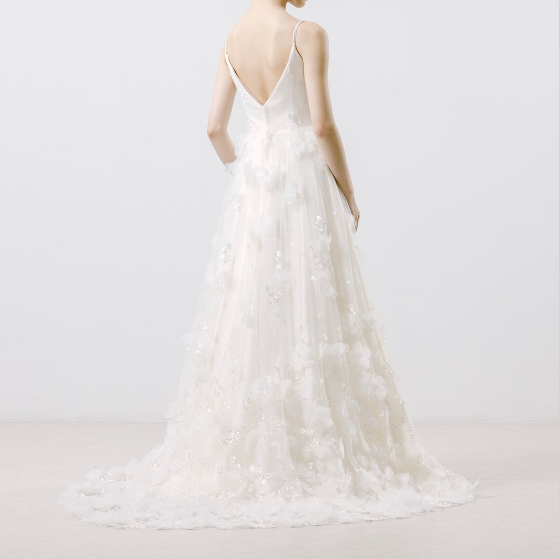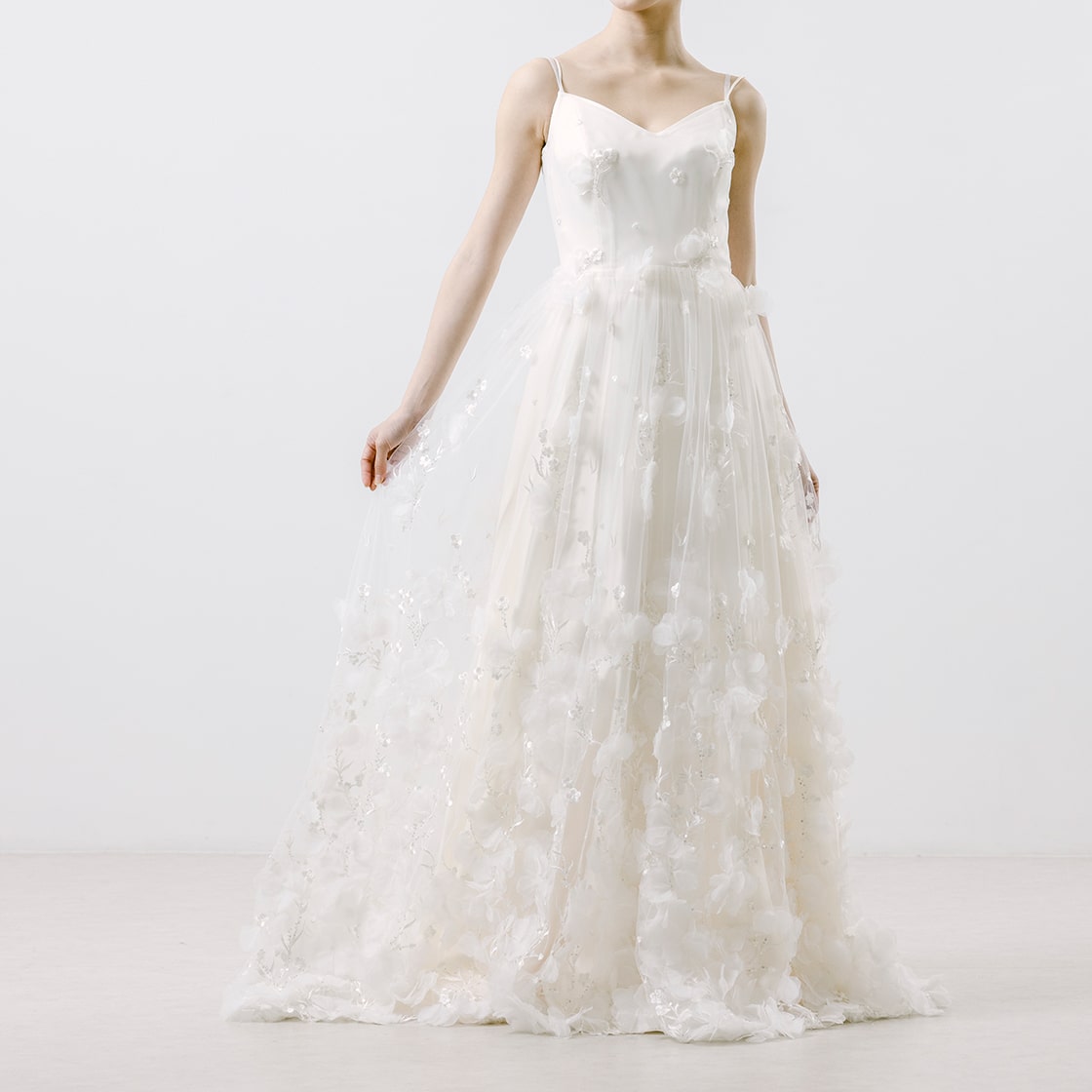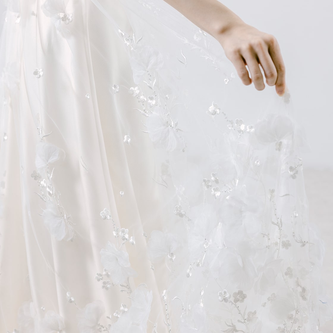 立体フラワーと立ち上がる印象的な刺繍が華やかさを演出します。