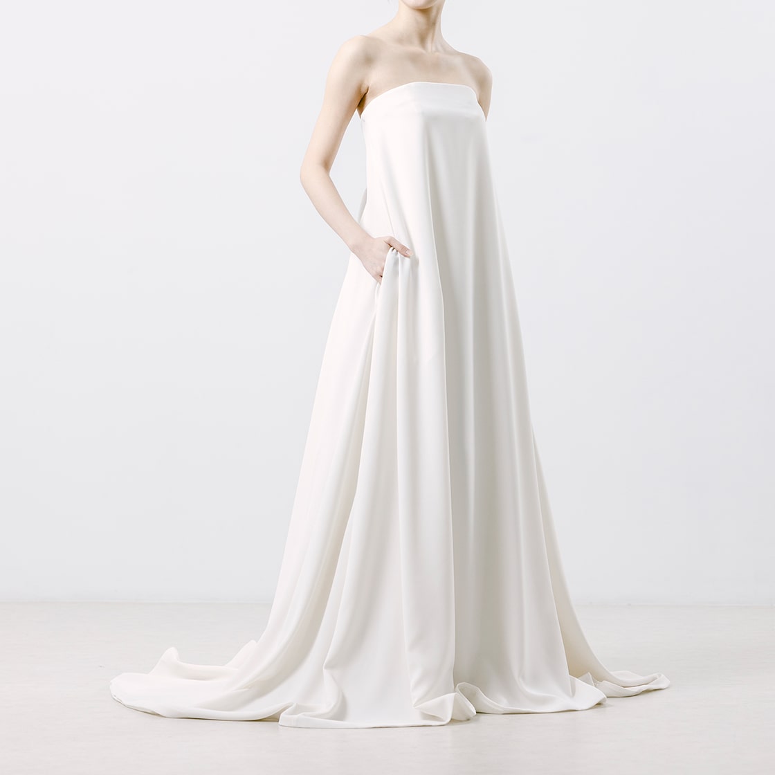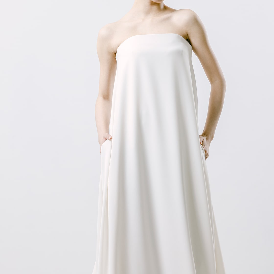 とろみのあるツイルを使用し、自然に広がるシルエットで体のラインを優しく包み込むドレス。
